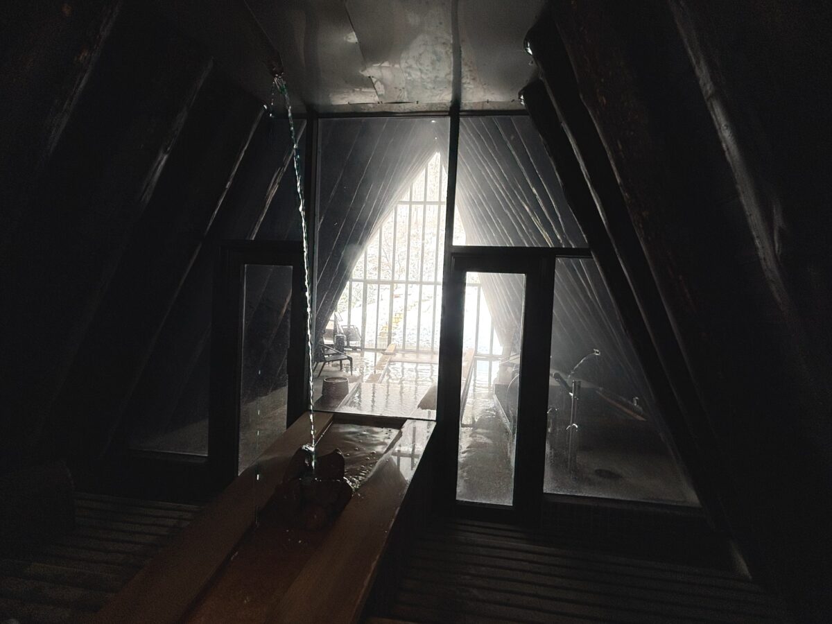 真ん中に温泉の浴槽があり、立って入れる深さになっています。外の気温は氷点下だったので、まずはこの立ち湯で冷えた体を湯通ししました。源泉が熱いので、湯口近辺は熱いです!少し離れたところに行って、自分の好きな温度を探します。