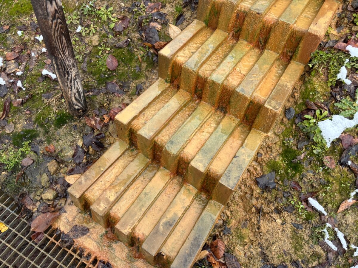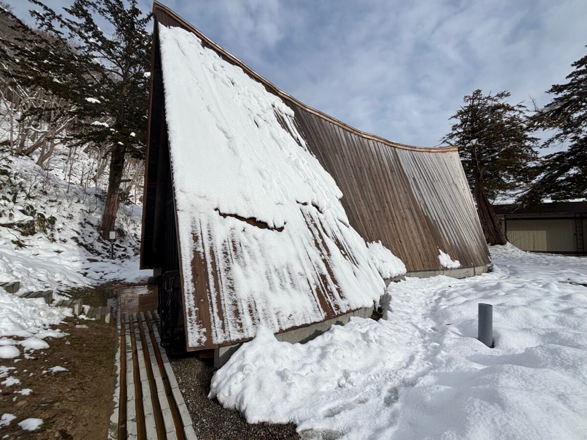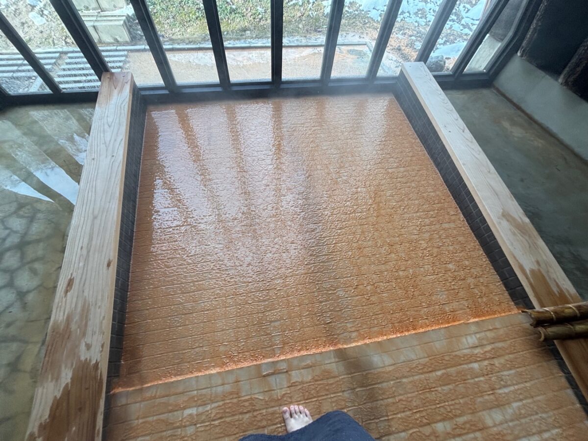 貸し出されるサンダルで向かうのですが、道中の歩道は流れる温泉で雪が溶かされていました。温泉の成分で茶色っぽくなっていて、滑りやすいので注意してくださいね。