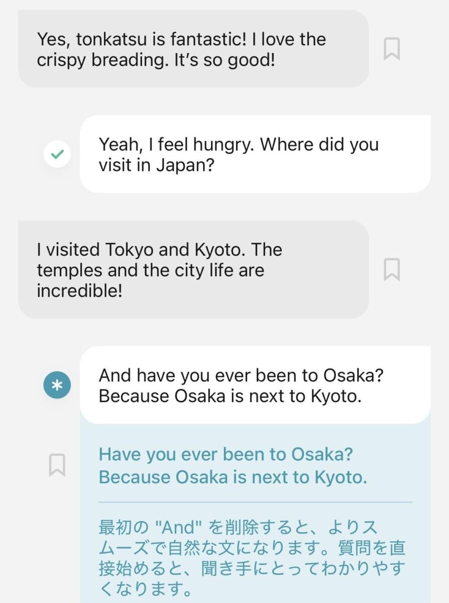 レストラン、カフェ、旅先、自己紹介など、具体的なシーンを自分で設定し、AIが言い回しの改善点をその場で提案してくれます。間違えやすい前置詞や時制をすぐに直してくれるので、実用的な英語がどんどん身につく感覚があります!実際、英語の先生にも、前置詞や時制が前より良くなったと褒めてもらいました!
